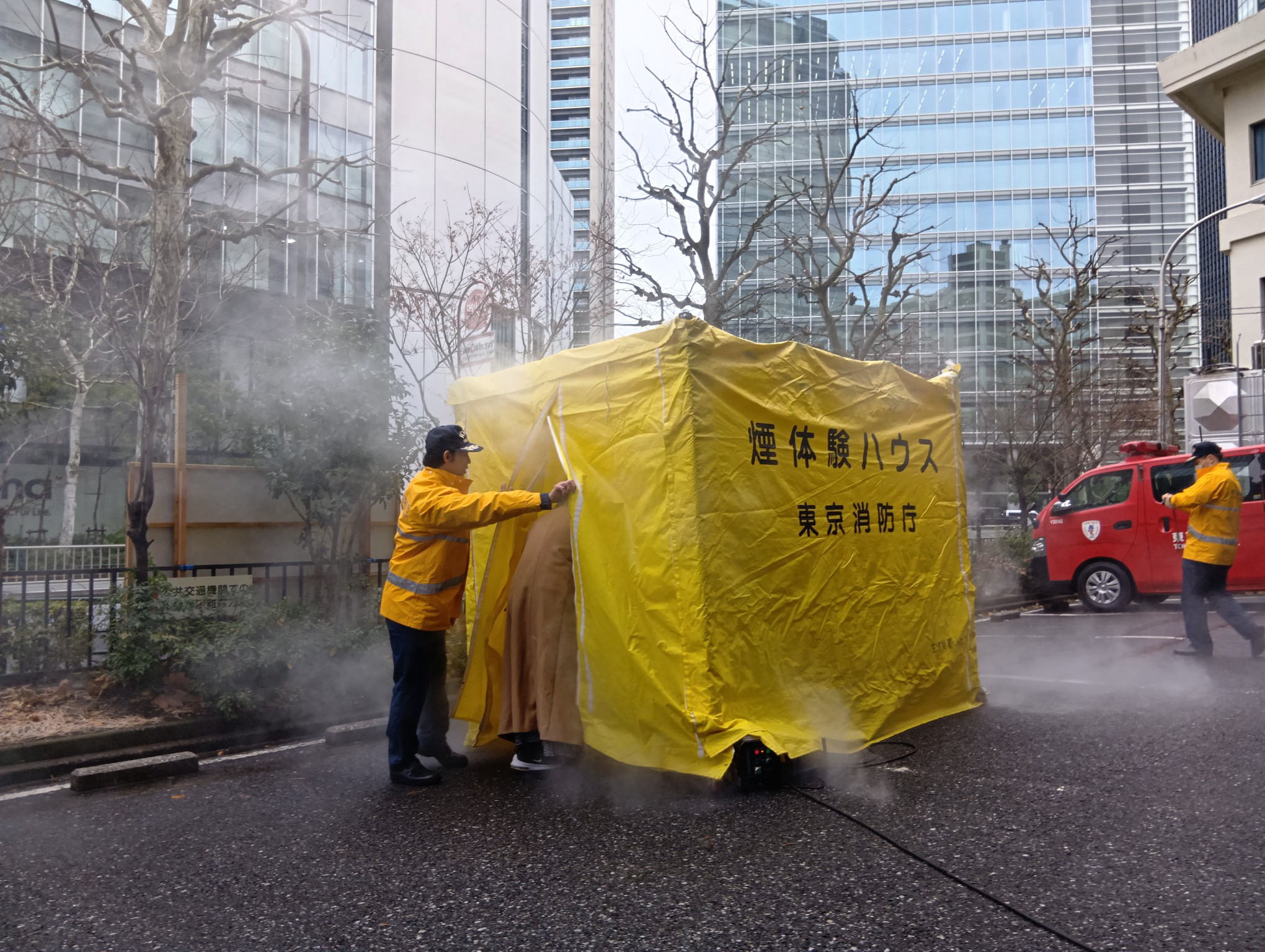 その後、体験してみる、ということで、今回は地震の後などの火災を想定して、煙体験という訓練を行いました。